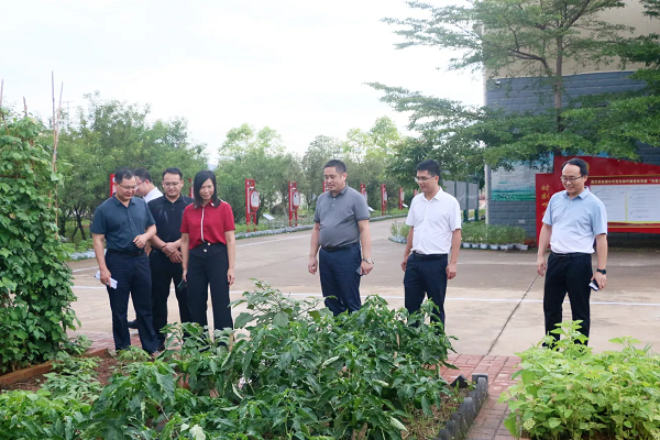 梁德涛(右二)陪同周顺平(右三)一行考察浦北县金浦小学校园