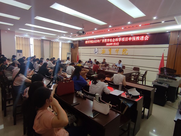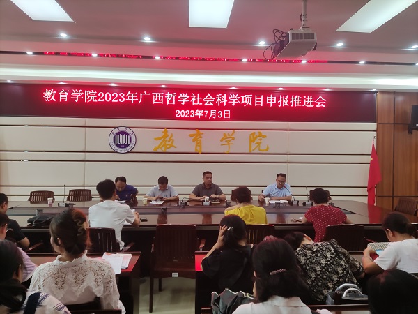 为进一步推进学院科研发展,增强教师的科研动力,教育学院组织开展2023年广西哲学社会科学规划课题申报推动员会。会议于2023年7月3日在1A-412会议室举行,尹闯副院长主持,学院全体教职工参加。