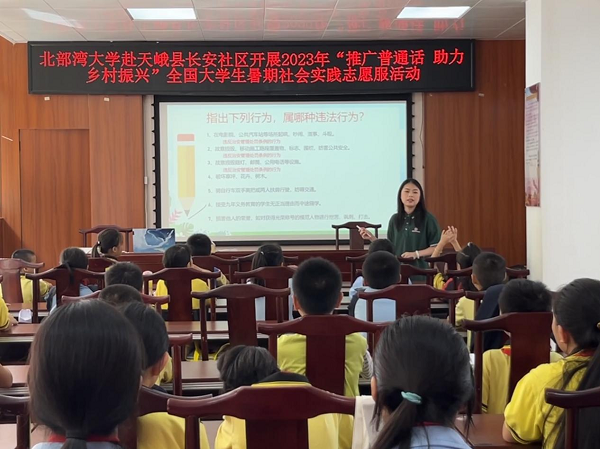 为深入学习贯彻落实党的二十大精神,加大国家通用语言文字推广力度,助力乡村振兴战略实施,2023年8月1日至3日,北部湾大学赴河池天峨助力乡村振兴服务队在曹桂磊、李惠、黄文强等教师的带领下,前往广西天峨县易地扶贫搬迁长安家园开展2023年“推普助力乡村振兴”全国大学生社会实践志愿服务活动。
