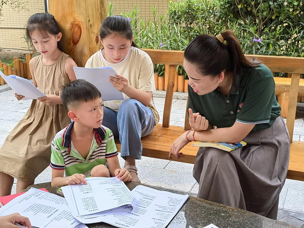 服务队指导老师对参加朗诵比赛同学进行朗诵指导