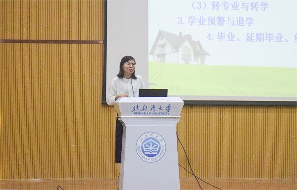 梁永忠主任介绍了北部湾大学图书馆的基本情况、图书馆的管理制度等,并鼓励同学们充分利用图书馆中的各种资源,掌握查找资料的方法,常到图书馆阅读、学习,提升自身的科学文化素养。