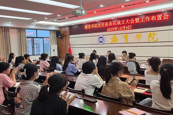 为深入学习贯彻党的二十大精神,激发党员先锋模范带头作用,提高党员服务师生、服务学院发展的质量和水平,2023年10月9日晚,教育学院党员服务队成立大会暨工作布置会在1-412召开。学院党委书记叶汝坤、党务秘书陈琪、学生第一党支部书记罗晓霞以及党员服务队全体成员参加此次会议,会议陈琪同志主持。