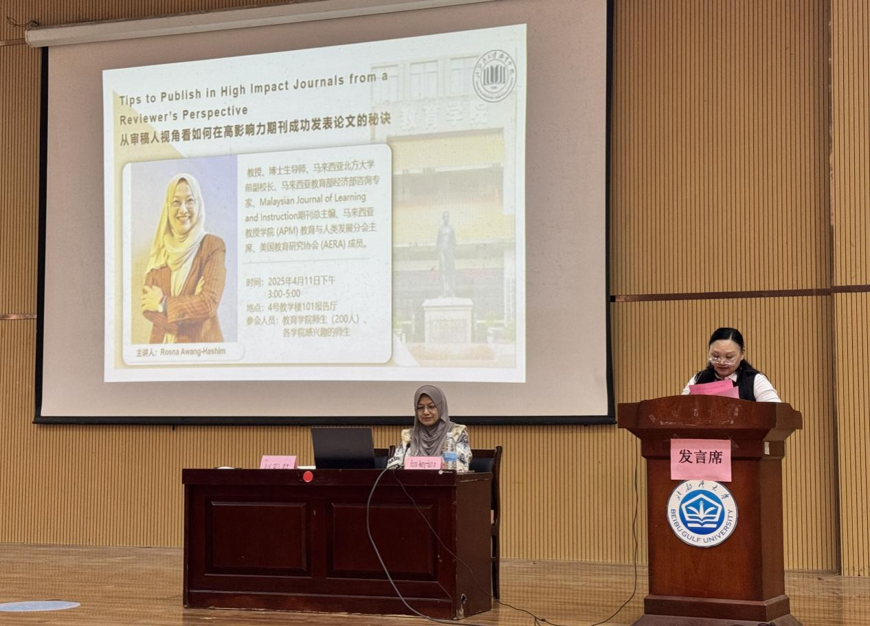 在下午的学术报告中,Rosna教授《从审稿人视角看高影响力期刊投稿及发表策略》为题作专题学术报告。她结合自身担任期刊主编及审稿人的丰富经验,系统剖析了高影响力期刊的投稿全流程与核心策略,指出论文选题需立足国际热点领域,同时兼顾本土实践价值,强调“研究创新性应通过填补学术空白来体现”。她深入解读了期刊编辑初审的九大评估维度,包括选题适配性、学术规范性和国际合作潜力等。并以马来西亚高校“师生联合发表”模式为例,鼓励学生“从毕业论文中提炼高质量数据,与导师合作向SSCI/ESCI期刊投稿”。Rosna教授的讲座为学院师生们对国际期刊论文投稿及发表有了更清晰的认识和更明确的方向。学院将以此为契机,进一步加强国际交流与合作,不断提升办学质量和学术水平,为培养具有国际视野和竞争力的高素质人才做出贡献。