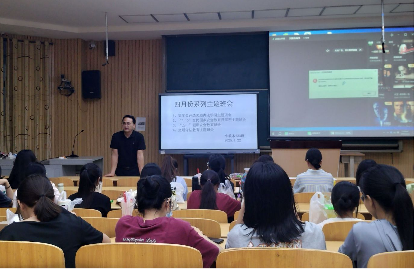 在奖学金评选奖励办法学习班会上,班长围绕评选条件、申请流程、评审标准等核心内容,对评选政策与流程进行了详细解读;“4.15”全民国家安全教育日保密主题班会,以播放视频、知识竞答等形式,普及国家安全知识,强调保密工作重要性;“五一”假期安全教育班会聚焦出行、财产、网络安全,班主任提醒学生遵守交规、警惕意外、防范诈骗;文明守法教育主题班会上,通过观看法治影片、主题演讲,引导学生树立法治观念。