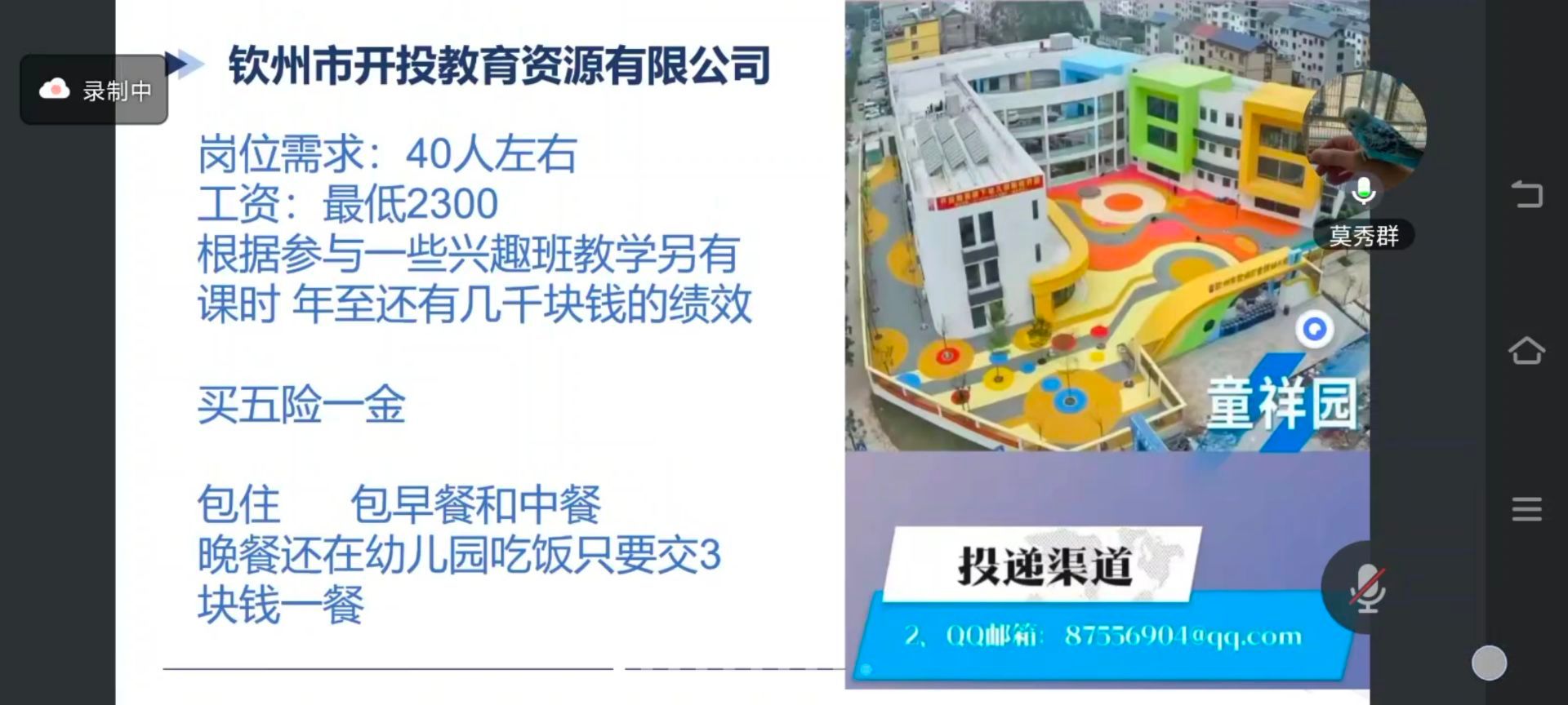 会议伊始,党委副书记莫秀群结合学前教育行业发展前景,从政策扶持、薪资待遇等方面分析就业优势,重点推介了钦州市开投教育集团旗下的童禾、童祥等五所幼儿园,以及北流市幸福第一幼儿园等优质单位。她强调,就业需立足长远规划,鼓励学生主动把握当前“政策红利期”,积极投身基层教育实践。