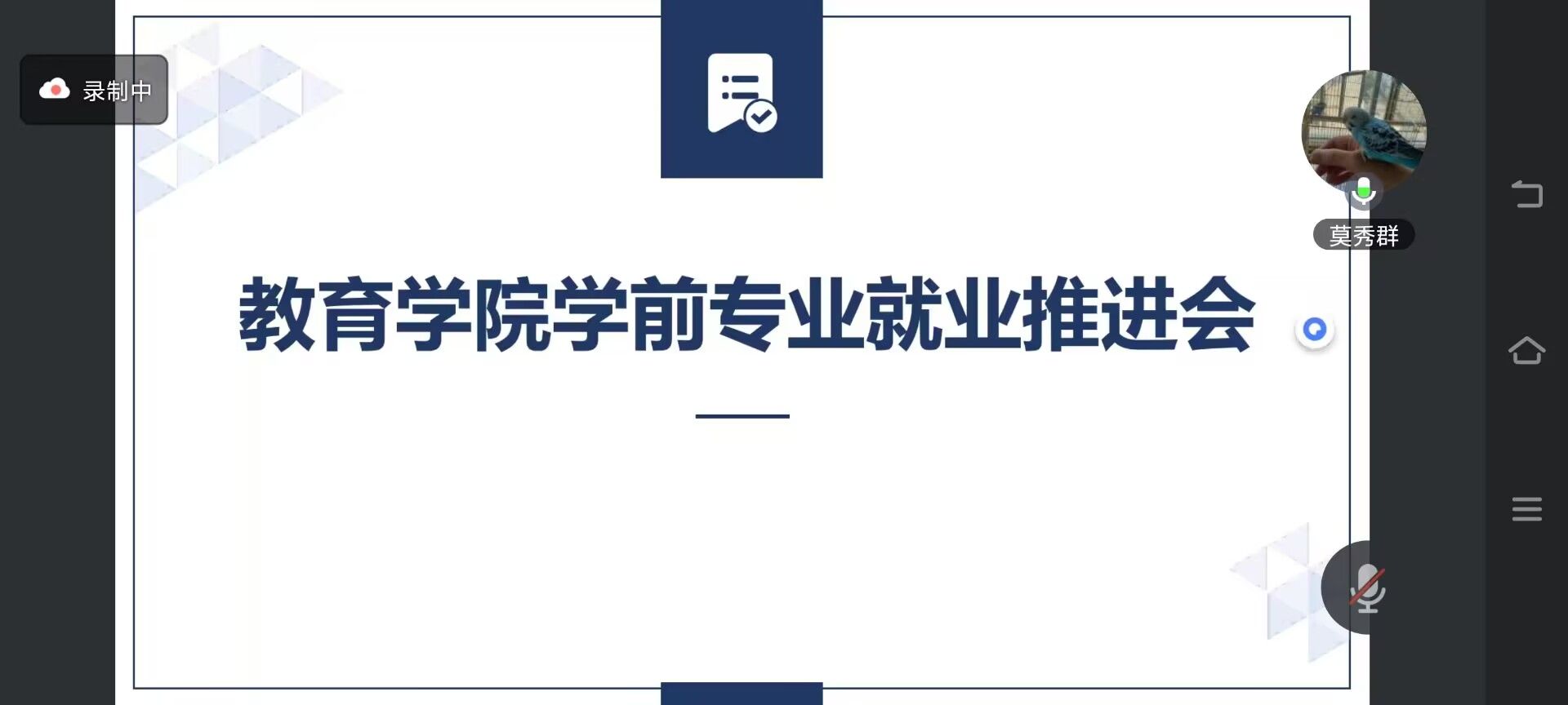 为助力应届毕业生精准就业,5月21日下午,我院召开学前教育专业线上就业推进会。会议由院党委副书记莫秀群主讲,辅导员郑娇萍及2025届全体学前教育专业毕业生参会。