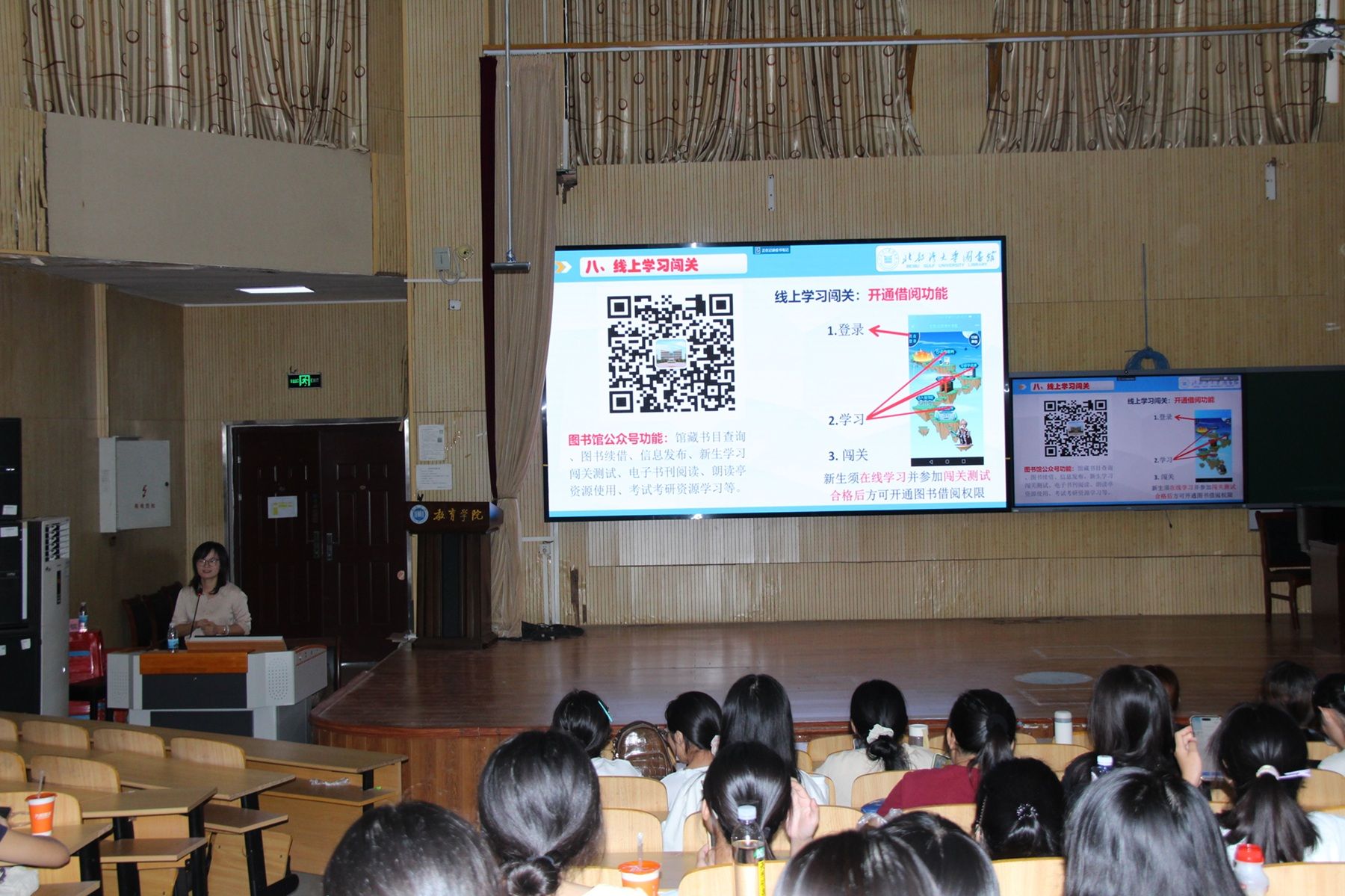 最后,蓝水萍老师详细介绍北部湾大学图书馆的整体布局、馆藏资源、管理制度及使用方法。她鼓励新生主动走进图书馆,充分利用馆藏文献、数字资源等学习平台,持续提升科学文化素养。
