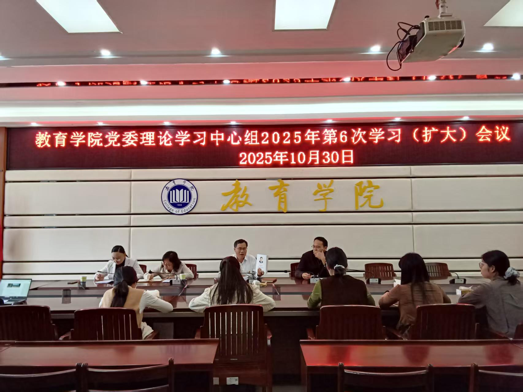 为深入学习贯彻《习近平谈治国理政》第五卷,深入学习贯彻党的二十届四中全会精神,进一步推动学院全面深化改革和高质量发展,2025年10月30日下午,教育学院党委理论学习中心组召开2025年第6次专题学习会议。学院党委书记叶汝坤主持会议,学院党委委员、师生党支部书记参会。