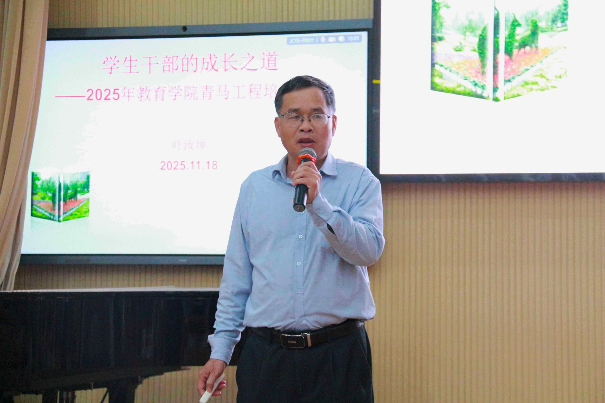 为进一步加强学生干部的责任担当与思想引领能力,2025年11月18日下午,我院于1B-115报告厅举办以“学生干部的思想政治道德意识”为主题的专题培训。本次培训由学院党委书记叶汝坤主讲,院团委学生会干部及教育学院2023-2025级各班班委共同参加。