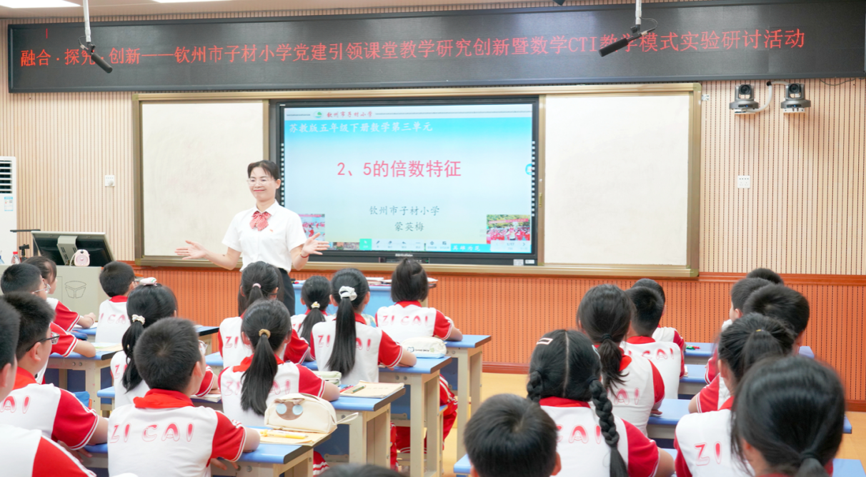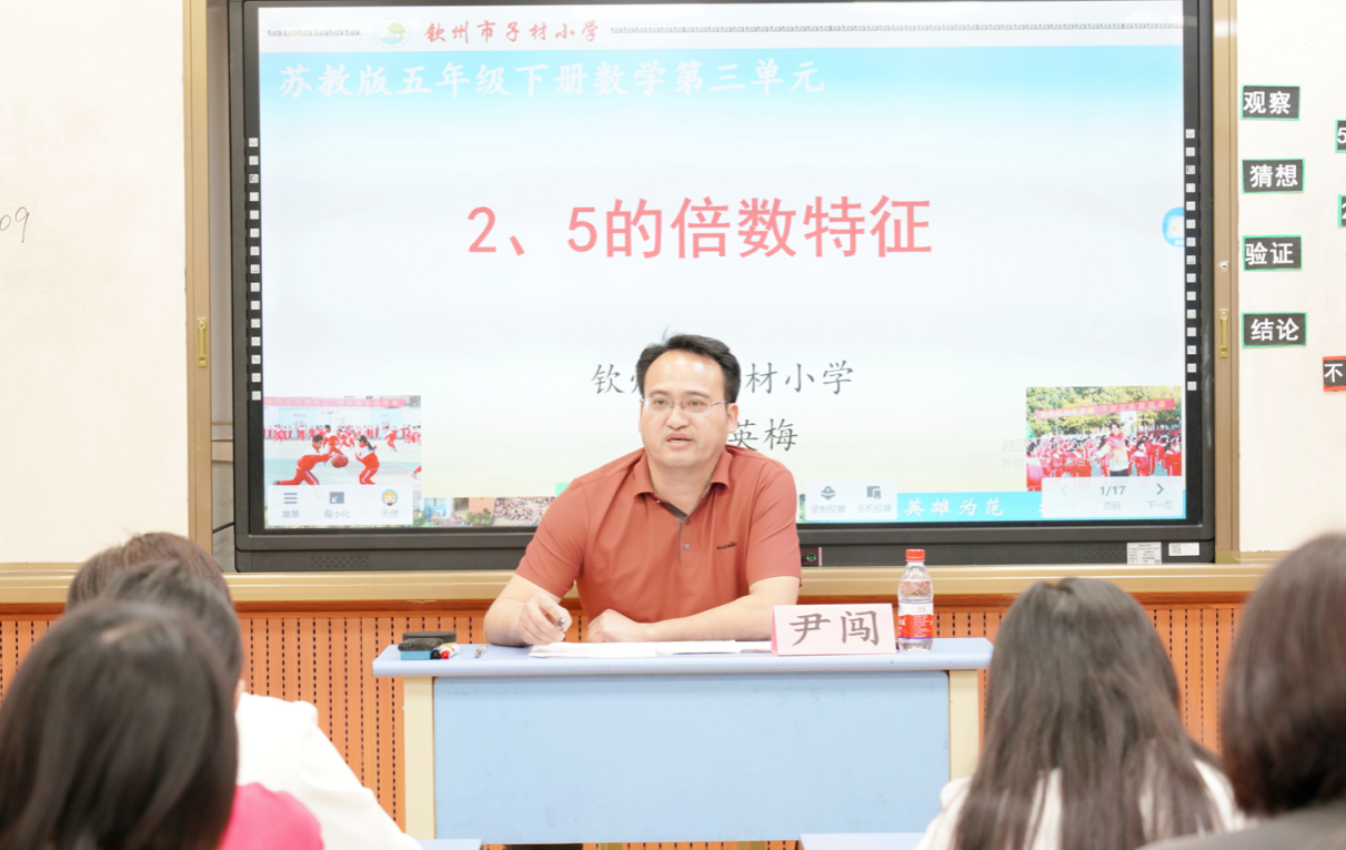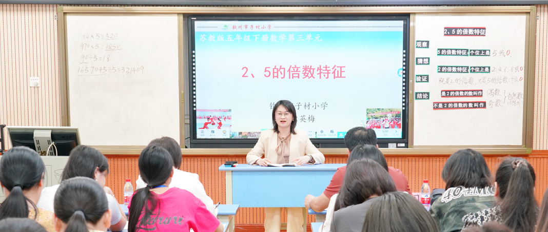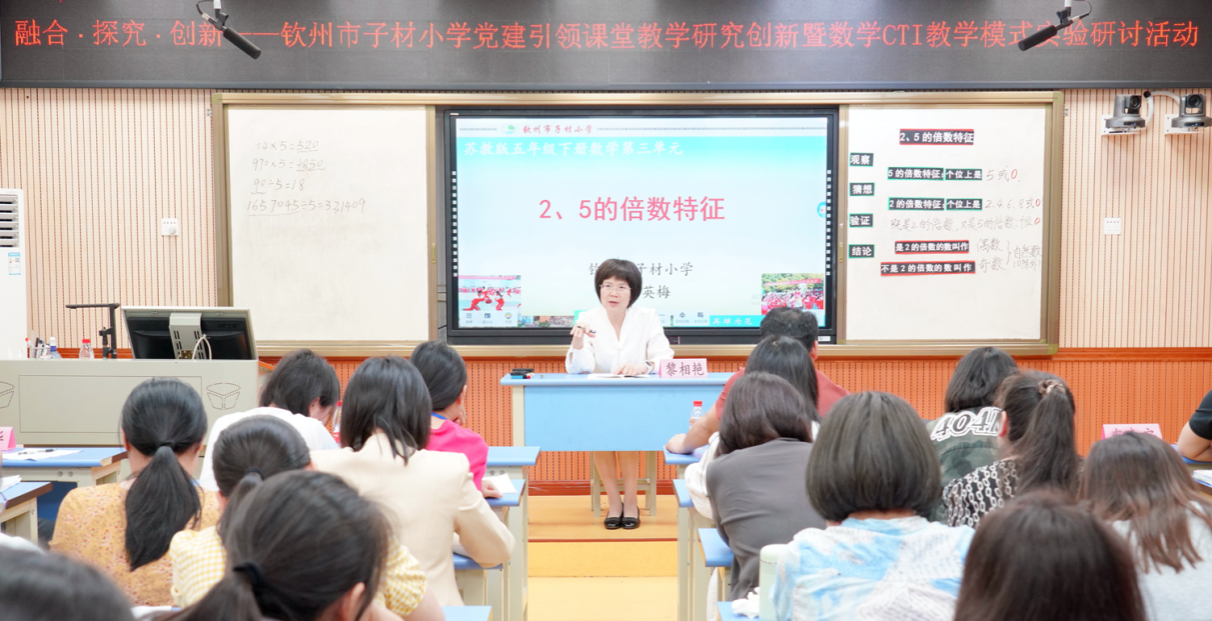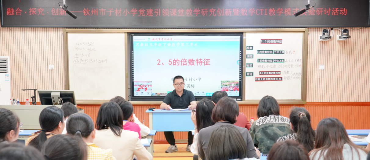 活动在子材小学蒙英梅老师执教的五年级数学课《2和5的倍数特征》中拉开序幕。本节课是CTI教学模式的一次实践呈现,蒙老师严格遵循“创设情境、探究建构、迁移应用、创新应用”的流程,引导学生借助百数表,经历“观察-猜想-验证-结论”的完整探究过程,自主发现规律,并通过分层练习巩固理解。课后反思中,蒙老师认为CTI模式提供了清晰框架,但在引导学生从“发现特征”迈向“理解原理”的深度思考上,仍有提升空间。