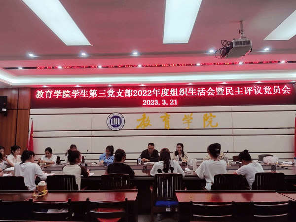 3月21日晚,教育学院学生第三党支部在1A-412会议室召开2022年度组织生活会暨民主评议党员会议。由于2021级党员在校外实习,会议通过线上与线下结合的方式开展。党委委员尹闯、学生第三党支部书记周蓉蓉及全体党员参加会议。