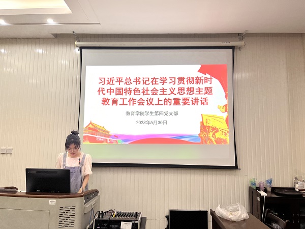 2023年5月30日晚,教育学院学生第四党支部于1A-412会议室学习贯彻习近平新时代中国特色社会主义思想主题教育工作会议上的重要讲话。我院学生第四党支部书记归妙玲以及支部全体党员、发展对象参加此次会议。本次会议由尹芳银同志担任主持人。