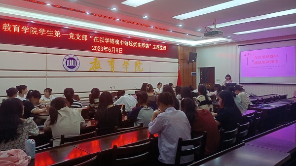 6月8日下午,教育学院学生第一党支部书记罗晓霞以“在以学铸魂中锤炼崇高师德”为题,为教育学院学生第一党支部全体党员讲授专题党课。