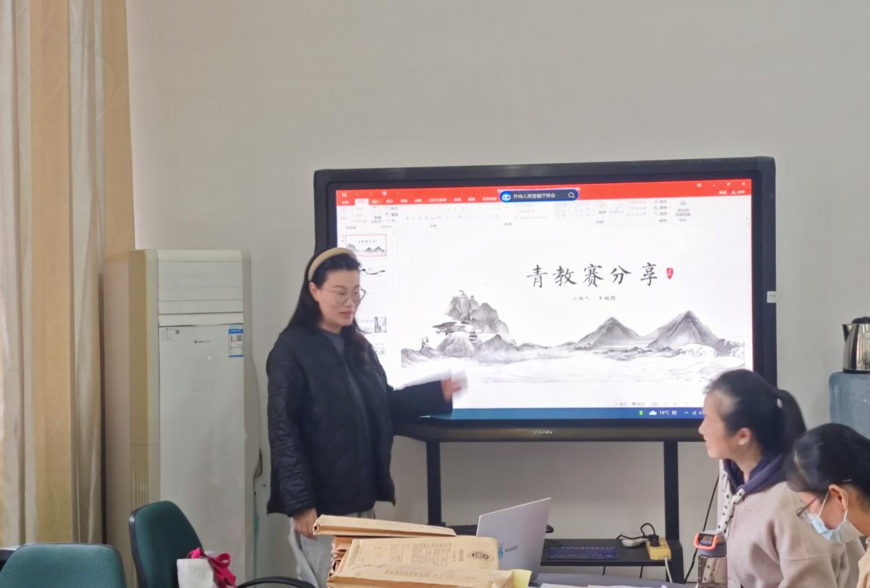 在本次教研活动中,王婉聪老师根据比赛简介、教学内容的选取、研读评分标准、参赛材料准备和模拟演练等内容,进行了青教赛的交流与分享。首先,在教学内容的选取上,强调思考自身学科优势,全局把握自己的教学内容。其次,在教学设计的过程中,应突出育人理念,准确把握课程的重点和难点,切实做到针对性强。最后,可以通过具有学科特色的课堂导入、可视化板书、互动节点增强课堂吸引力,不断优化自身的授课风格。
