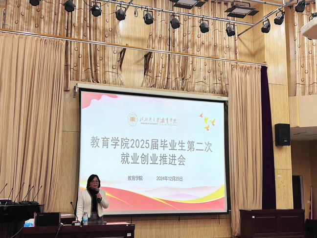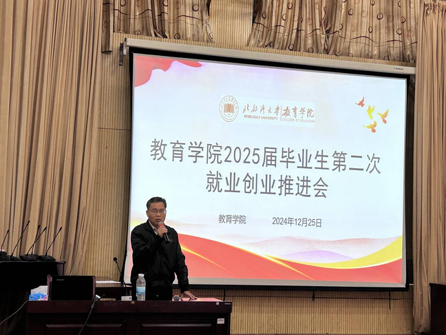 12月25日,教育学院于1B-115报告厅召开2025届毕业生第二次就业创业推进会,助力2025届毕业生更好地求职就业,部署下一阶段就业工作。学院党委书记叶汝坤、党委副书记莫秀群、学工办副主任曹桂磊、辅导员周蓉蓉、郑娇萍及2025届毕业生参会。