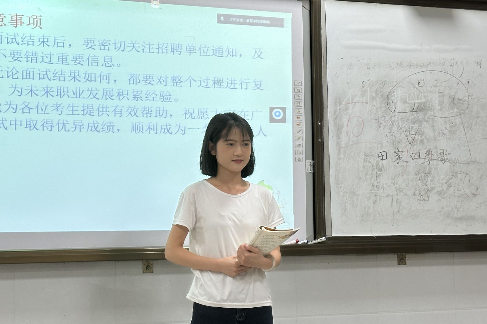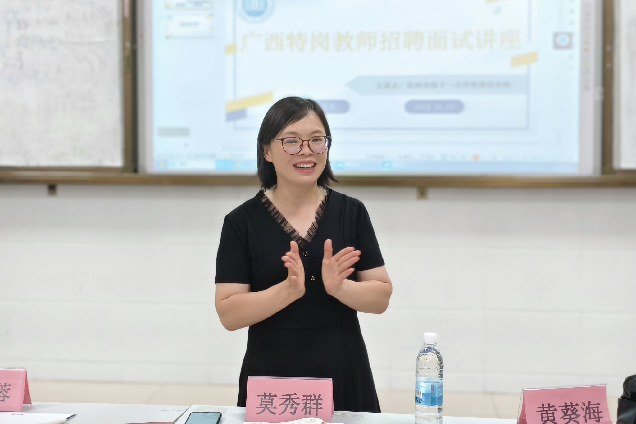 为助力毕业生提高特岗教师备考技巧,提升其就业竞争力,6月5日晚,教育学院特邀钦州市第十一小学黄葵海老师于1B-312教室举办特岗教师招聘面试指导讲座。院党委副书记莫秀群、团委书记曹桂磊、辅导员周蓉蓉出席讲座,2025届、2026届毕业生积极参与。