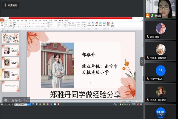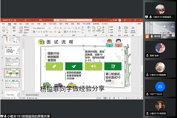 会议伊始,辅导员曹桂磊给2022届毕业生描述了目前的就业形态,鼓励同学们做好充分的就业准备,殷切希望同学们重视“应届毕业生”这一身份。接着,来自小教本181班求职成功的郑雅丹、陈静、杨镒菲三位同学做经验分享。其中,郑雅丹同学结合求职过程分享技巧,向同学们分享了面试小技巧,她表示自信从容是成功面试的重要法宝。陈静同学从提前关注招聘信息、物色心仪学校、准确递投简历、笔试注意事项四个方面来展开论述,她强调,递投简历应充分了解工作单位的相关信息。杨镒菲同学从获取工作信息渠道、面试准备、面试流程三个方面进行分享,她建议同学们要做好知识储备,并且要把握机会,不断勇往直前。最后,我院党委副书记陈鹏进行总结发言,他殷切希望2022届毕业生学会珍惜时间,坚定信念,端正求职心态,勇闯出属于自己的一片天地。