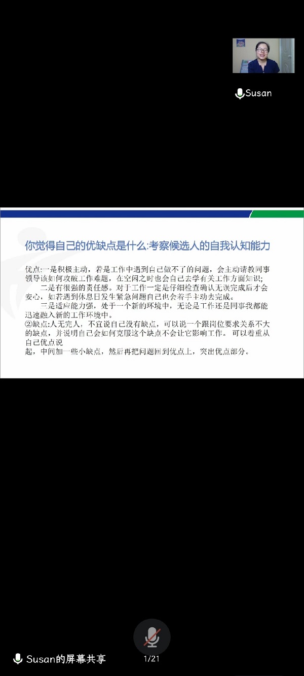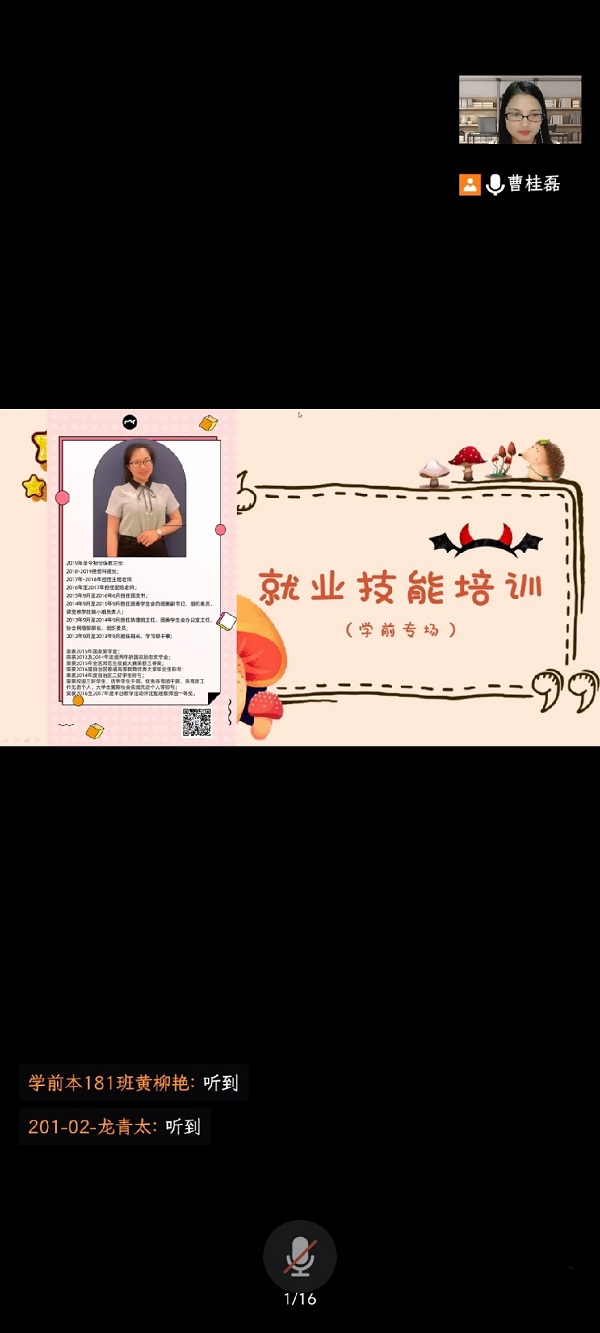 为了帮助同学们了解用人单位的用人需求,以需求为导向提升自身的求职技能水平,充分做好求职准备,5月10日,我院召开了“就业技能培训”线上会议。本次会议由添鸿文化教育集团廖老师担任主讲人,我院辅导员曹桂磊以及学前教育专业全体毕业生参加了本次会议。