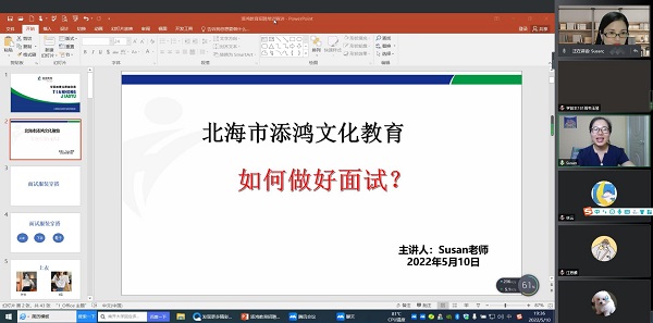 为了帮助同学们了解用人单位的用人需求,充分做好求职准备,同时给同学们提供更多的就业机会,2022年5月10日,我院开展了“添鸿教育集团专场宣讲招聘”线上会议。我院特邀请添鸿文化教育集团廖婕老师担任主讲人。我院辅导员曹桂磊及学前专业全体毕业生参加本次会议。