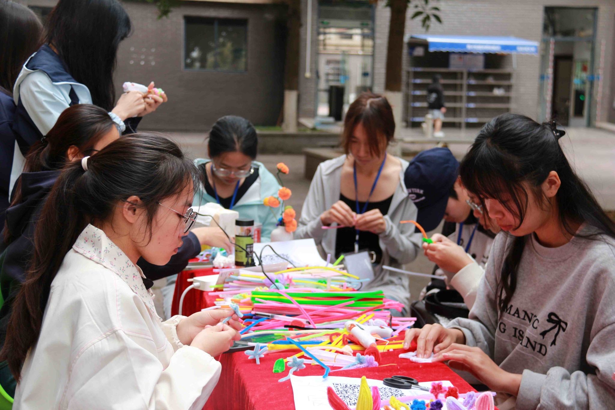 活动现场,工作人员准备了丰富的扭扭棒、装饰配件等材料,为同学们搭建创意平台。同学们围坐在一起,相互交流、互帮互助,指尖灵动间,将扭扭棒弯折、缠绕、组合,制作出花朵、海豚等精巧作品,每一件都承载着善意与敬意,生动诠释了雷锋精神中的“互助”内涵。活动结束后,同学们将亲手制作的手工作品,送到宿管员、食堂阿姨、环卫工人等一线劳动者手中,用简单真挚的行动,践行雷锋“服务人民、奉献社会”的核心要义,传递青春温暖。