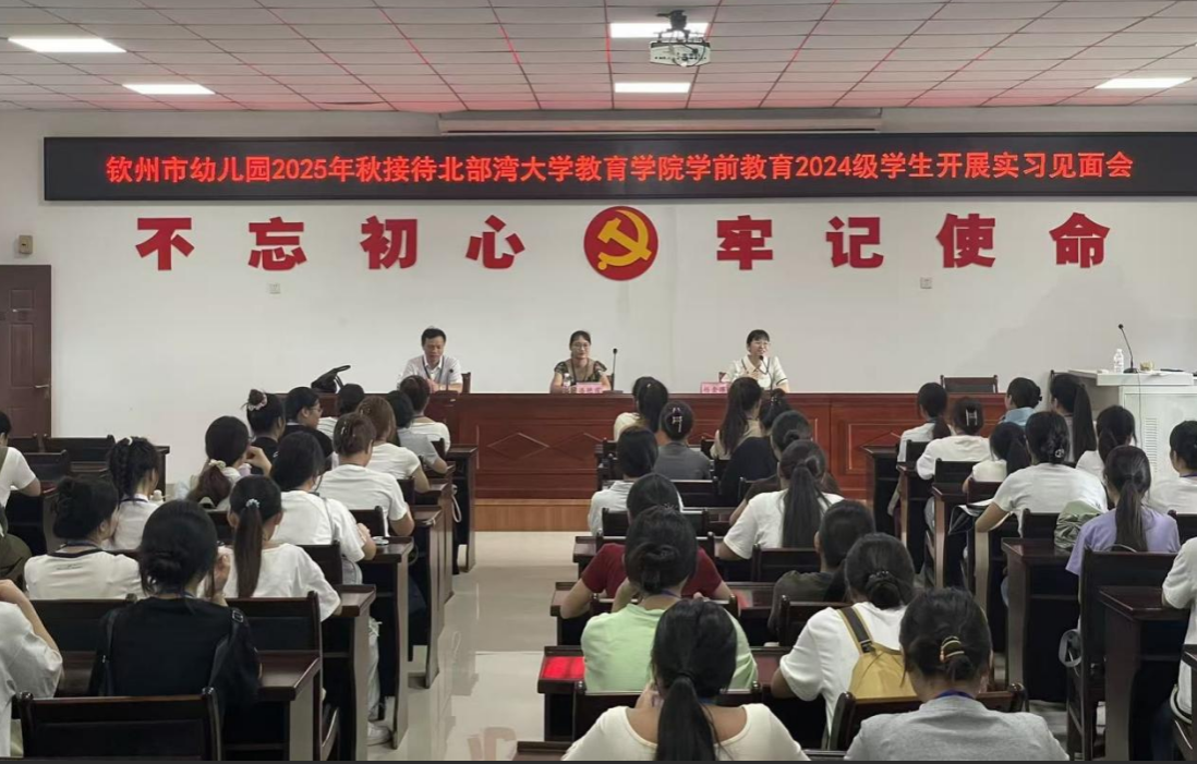 10月13日上午,钦州市幼儿园为实习生们精心举办了见面会。幼儿园副园长杨金萍首先致辞,她对实习生的到来表示热烈欢迎,详细介绍了幼儿园的办园理念、师资配置和日常保教工作流程,并寄语同学们珍惜实习机会,在实践中夯实专业基础、提升育人能力。随后,北部湾大学带队指导老师潘艳霞发言,她叮嘱实习生们要严格遵守幼儿园规章制度,虚心向一线教师请教,积极参与各项保教活动,做到学以致用、知行合一,同时强调了实习期间的安全注意事项。