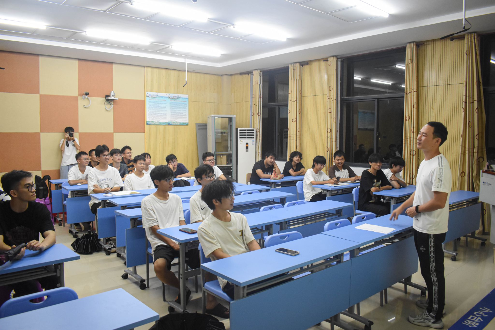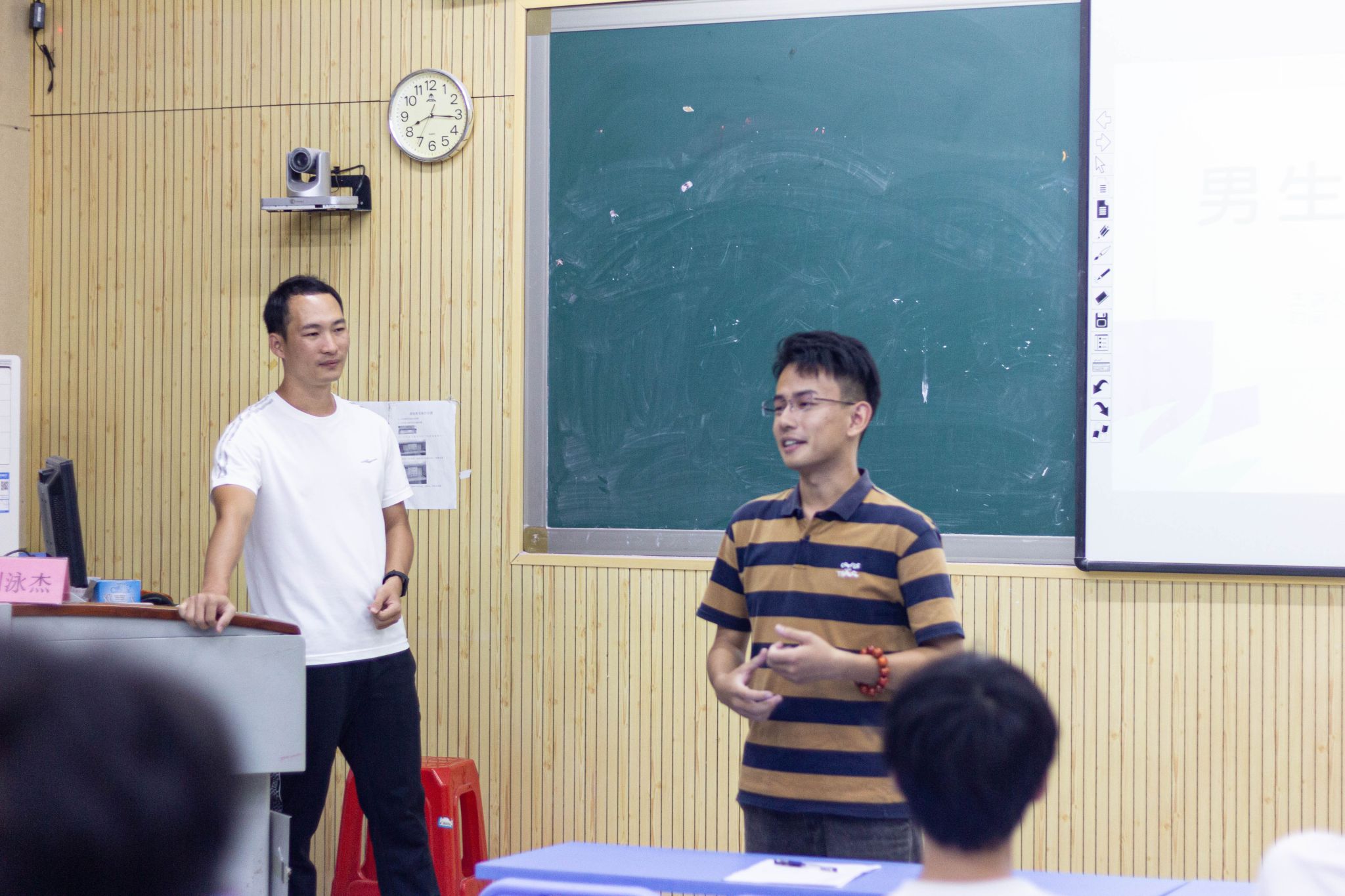 在男生讲座中,刘泳杰老师从心理和生理两个方面进行讲解,强调体育运动有益于我们的学习和生活。而后,他又结合实例阐述身心健康对于教育工作者的重要性。随后,研究生学长蔡乐天向同学们分享了他的学习经验,并鼓励同学们多多进行体育锻炼,增加文化阅读,促进个人身心健康发展。