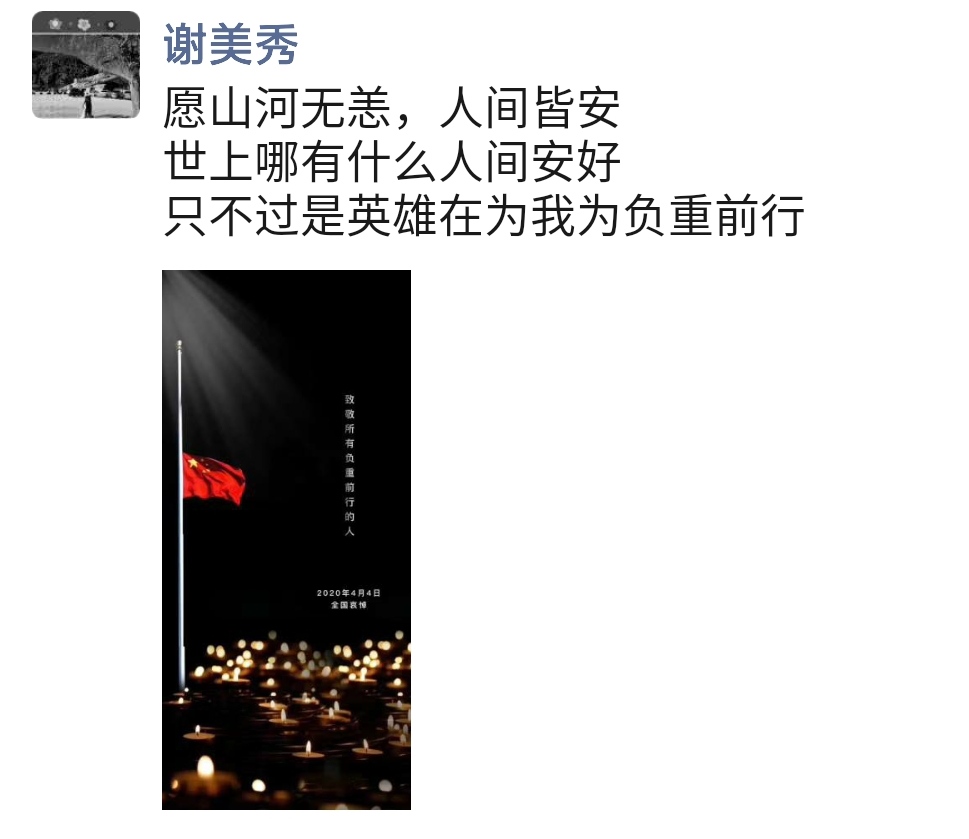 2020年的冬天,祖国打了一场无声的战斗,听不到猛烈的炮火声,却听得到冲锋,看不见滚滚硝烟,却看的见心痛的牺牲。冬去春来,我们看到大地复苏,得以再次拥抱太阳。可是,有些勇敢,坚毅,可爱的人却没有走出这个冬天。他们是生命守护家园的英雄和烈士,是不幸被病毒夺去生命的同胞和亲人,这些离去的背影,都值得我们敬佩,缅怀,为哀悼这些可爱的人们。